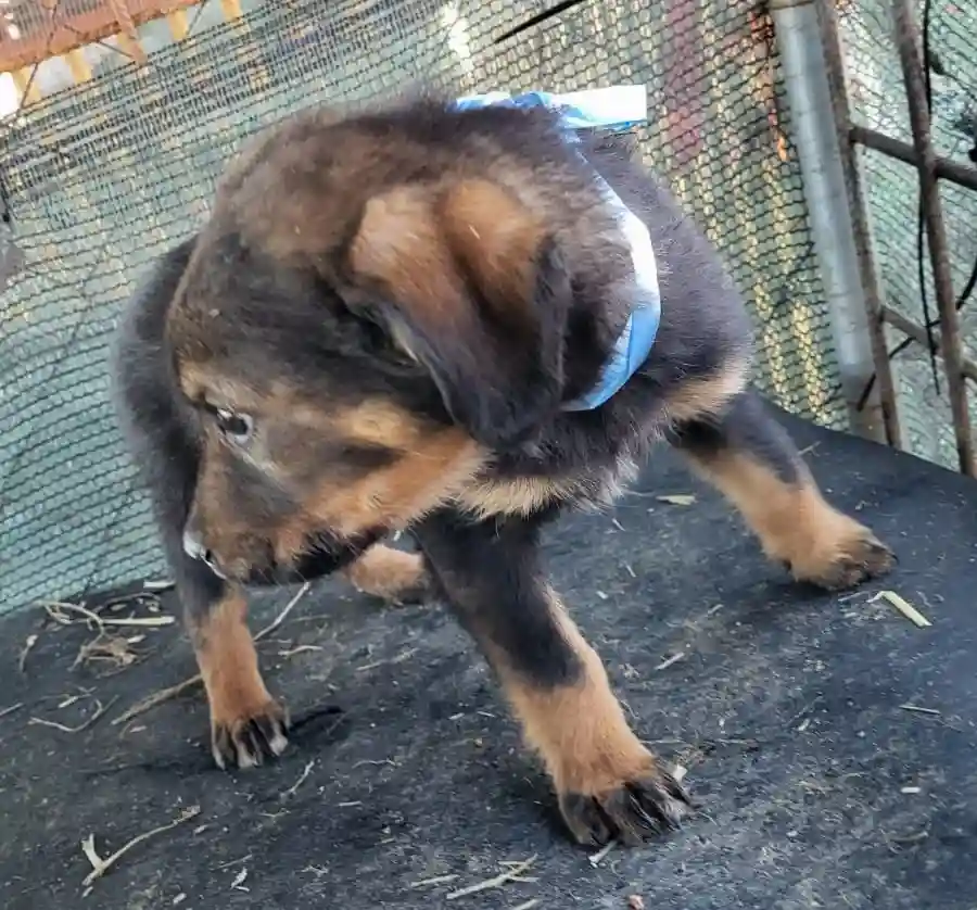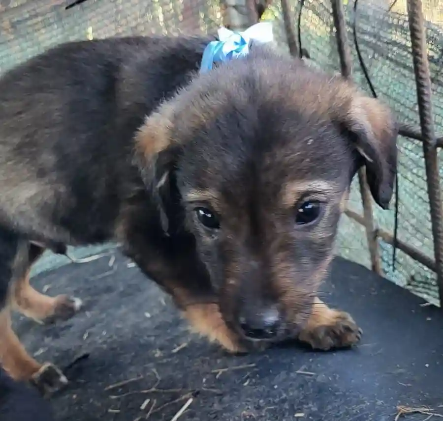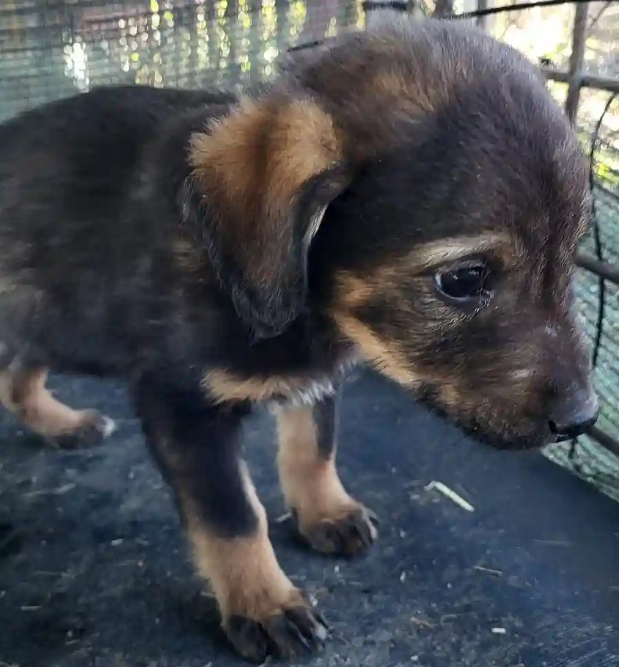 Ich bin ein kleiner Welpe und wurde im jungen Alter von Menschen aufgenommen und aufgezogen. Ausgewachsen werde ich ein kleiner bis mittelgroßer Rüde.